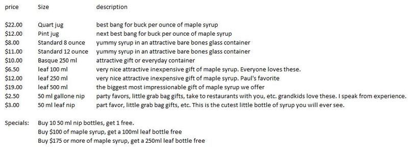We are excited you contacted us about buying maple syrup! The 2019 has been exceptional, and we still have syrup available for sale. Pricing is below. Just fill out the form below and we will let you know if we have the quantity and size you want is available. Shipping will be added when invoiced and shipped. Sandy and I believe you will find our prices comparable and consistent with other small niche producers. If we have a good year, we may offer maple sugar and maple candy.